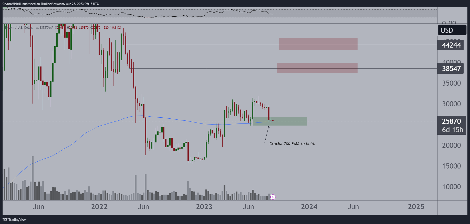 着眼于未来一周的交易格局,交易公司 8 的创始人兼首席执行官 Michaël van de Poppe 将 200 周指数移动平均线 (EMA) 标记为 25,700 美元左右,作为需要保护的关键支撑区域。