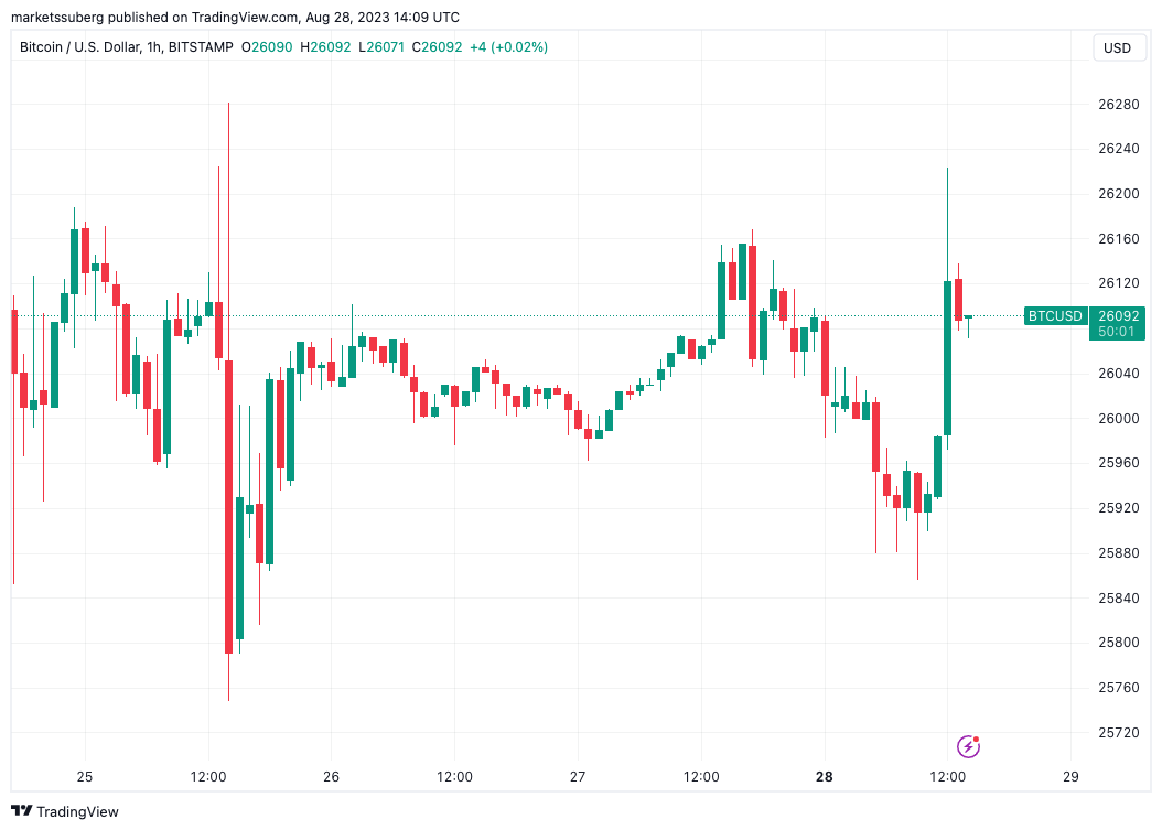 BTC/美元触及 26,226 美元,创下 8 月 25 日以来的最高水平,完全弥补了隔夜的疲软。