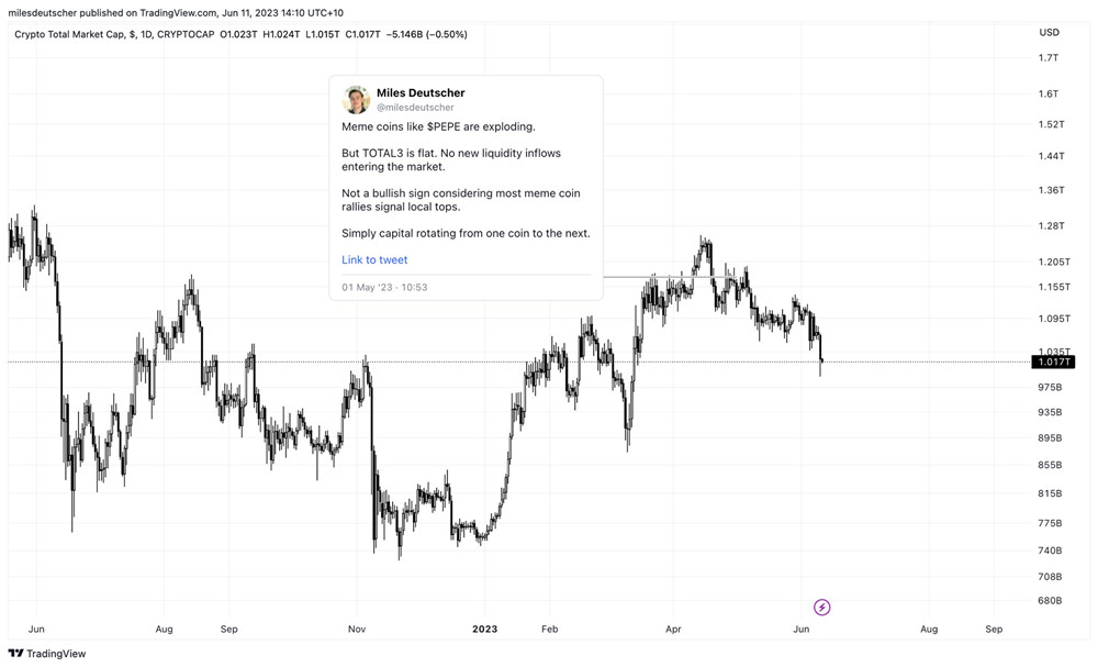 另一方面,在推特拥有34.1万粉丝的加密分析师Miles Deutscher也分享出一个惊人的巧合,那就是Meme币的热潮再次反映出一个市场周期的顶部讯号。Miles Deutscher表示:正如预测的那样,Meme币爆发最终代表着市场的顶部。甚至在美国证券交易委员会采取行动之前,就有明显迹象表明涨势即将结束:资金流入+流动性枯竭、Meme飙升、滞后于股票。