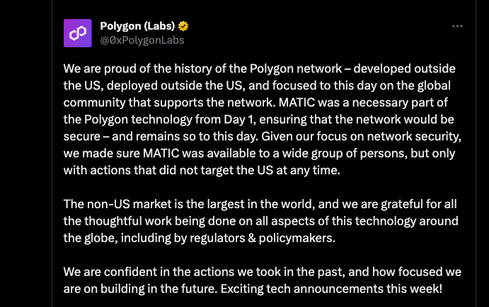 公告写道:我们为Polygon网络的历史感到自豪——它是在美国以外开发、部署,并且到今天仍专注于支持该网络的全球社群。MATIC从一开始就是Polygon技术的必要组成部分,确保网络的安全性——而且至今如此。考虑到我们对网络安全的关注,我们确保MATIC可供广大群体使用,但从未针对美国进行任何行动。非美国市场是全球最大的市场,我们对全球范围内在技术的各个方面进行的所有深思熟虑的工作,包括监管机构和政策制定者的工作,感到由衷的感激。