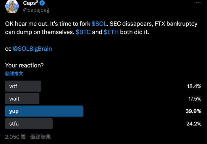 然而,社群对于此事件也有自己的看法。NFT项目DegenPicks共同创办人capsjpeg近日就在推特发起关于「是否同意分叉Solana(SOL),以摆脱SEC将其列入证券等问题」的投票,总计共有2,050人参与投票,其中39.9%支持分叉。