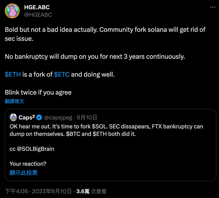 除了社群用户外,将Solana分叉的想法也获得一些KOL的支持,Abracadabra(ABCNFT)创办人HGE.ABC对此表示:大胆但实际上不是一个坏主意。社群分叉Solana将摆脱SEC问题。在接下来的3年里,没有破产问题会倒在他们身上。$ETH是$ETC的一个分叉并且做得很好。