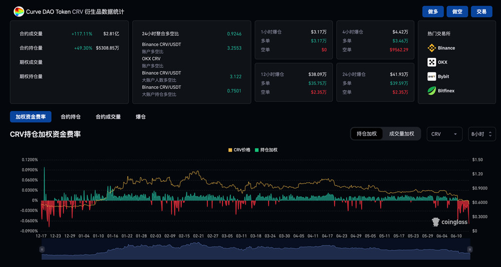 据Coinglass数据显示,全网CRV U本位永续合约转由空头向多头补贴,资金费率达-0.08%,创下今年以来新低。期货数据方面,近24小时成交量达2.81亿美元,增长超117.1%;合约持仓量达5,308.85万美元,增长超49.3%。