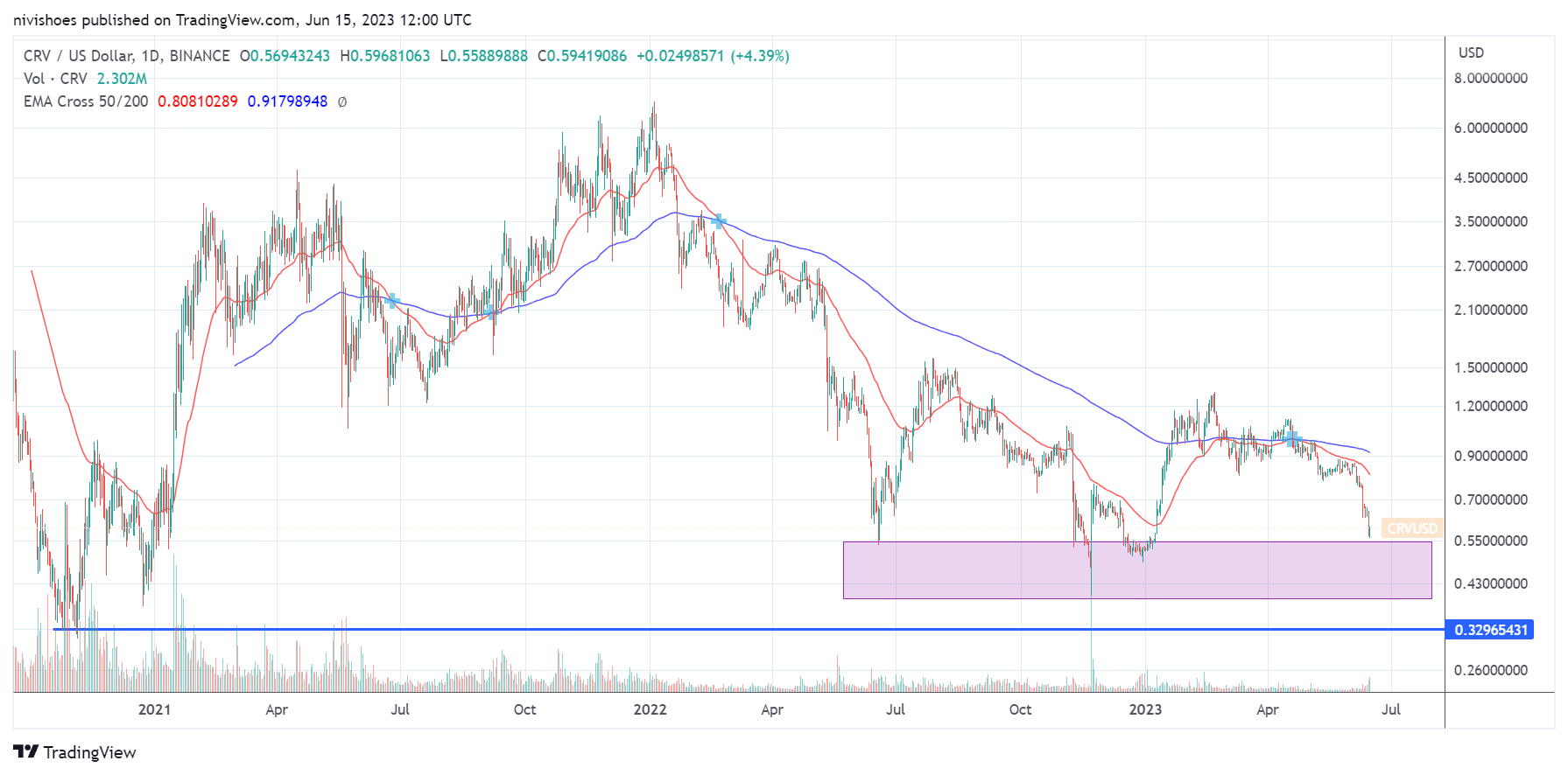 不利的一面是,跌破该支撑位可能导致抛售扩大至 0.32 美元附近的 2021 年低点。在发布时,CRV 最后交易价格约为 0.59 美元。